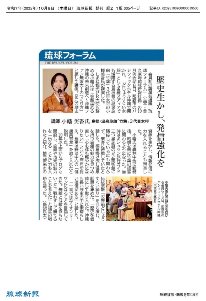 どじょうすくい女将の琉球フォーラム登壇の記事をいただき、